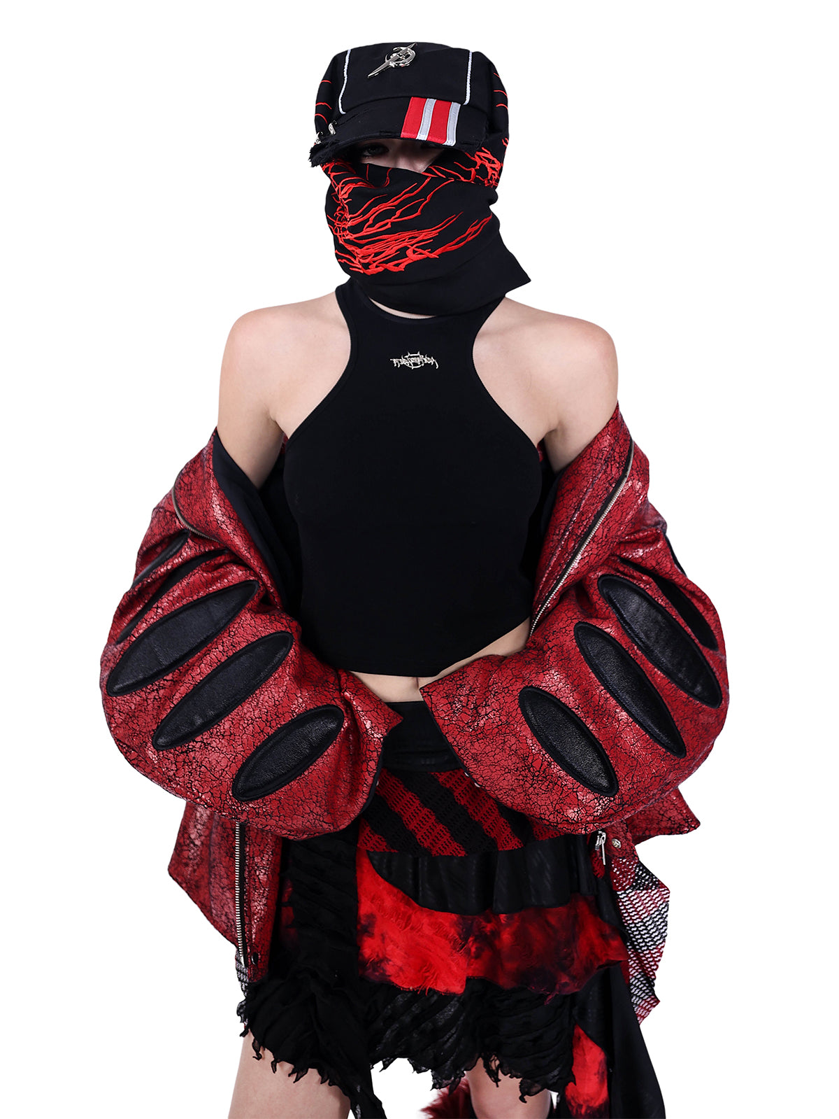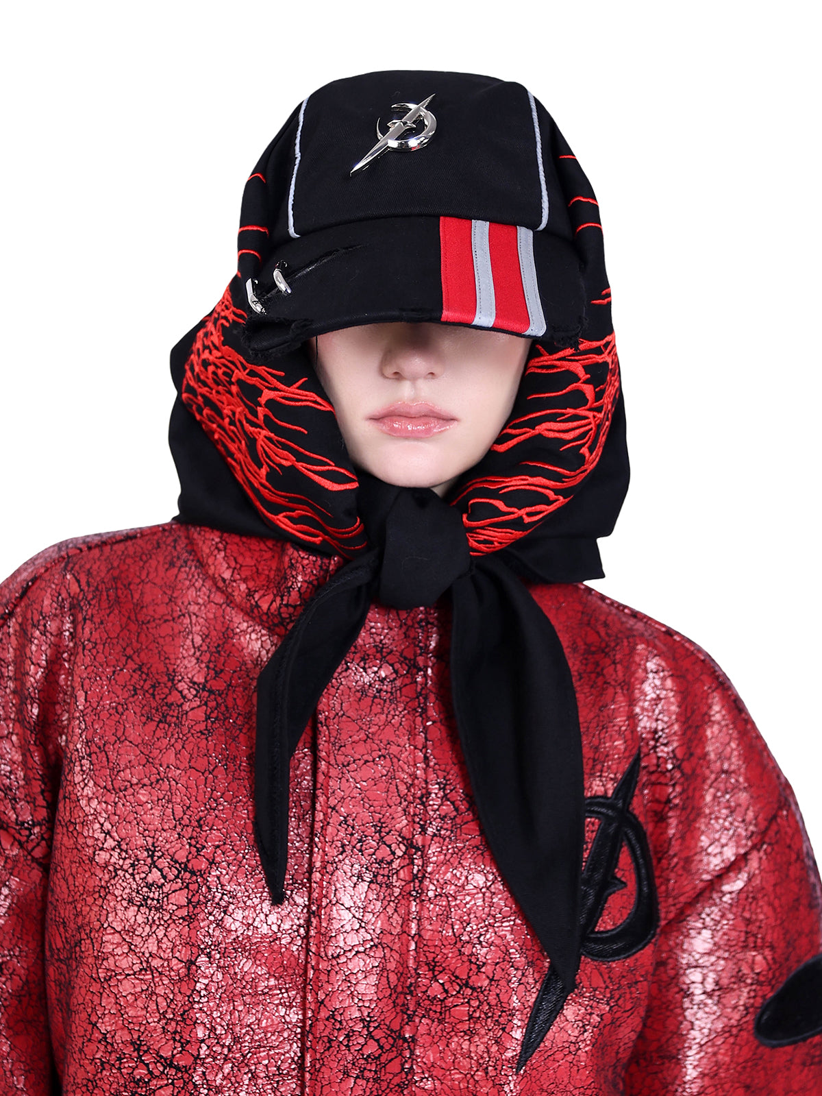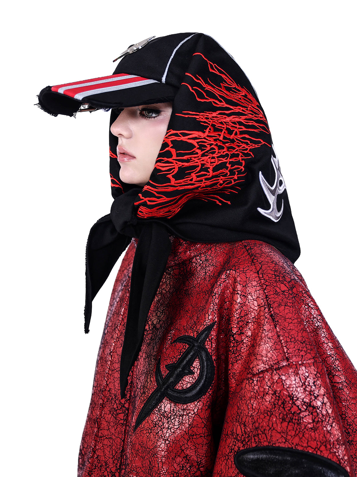 - Distressed visor with ripped effect, re-stitched using metal rings