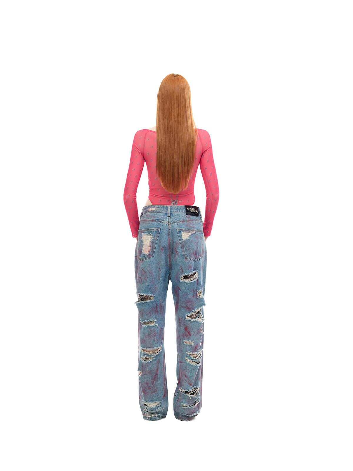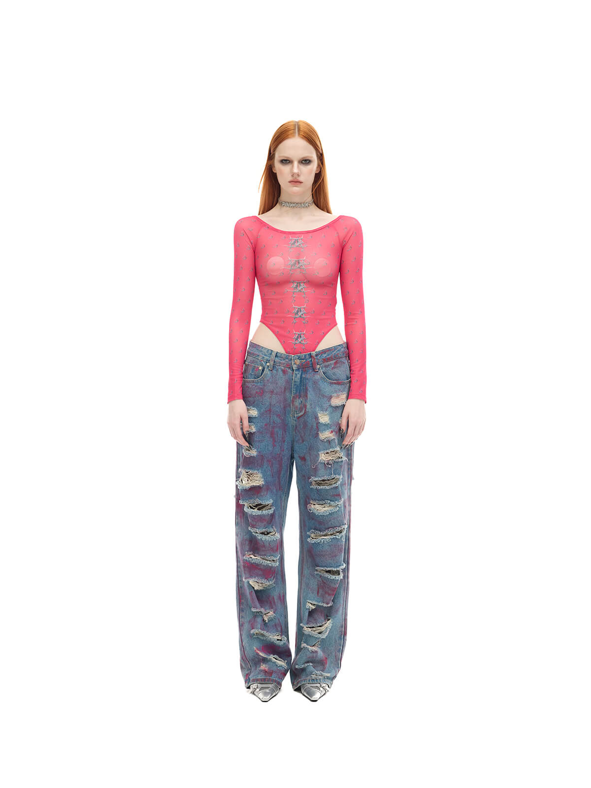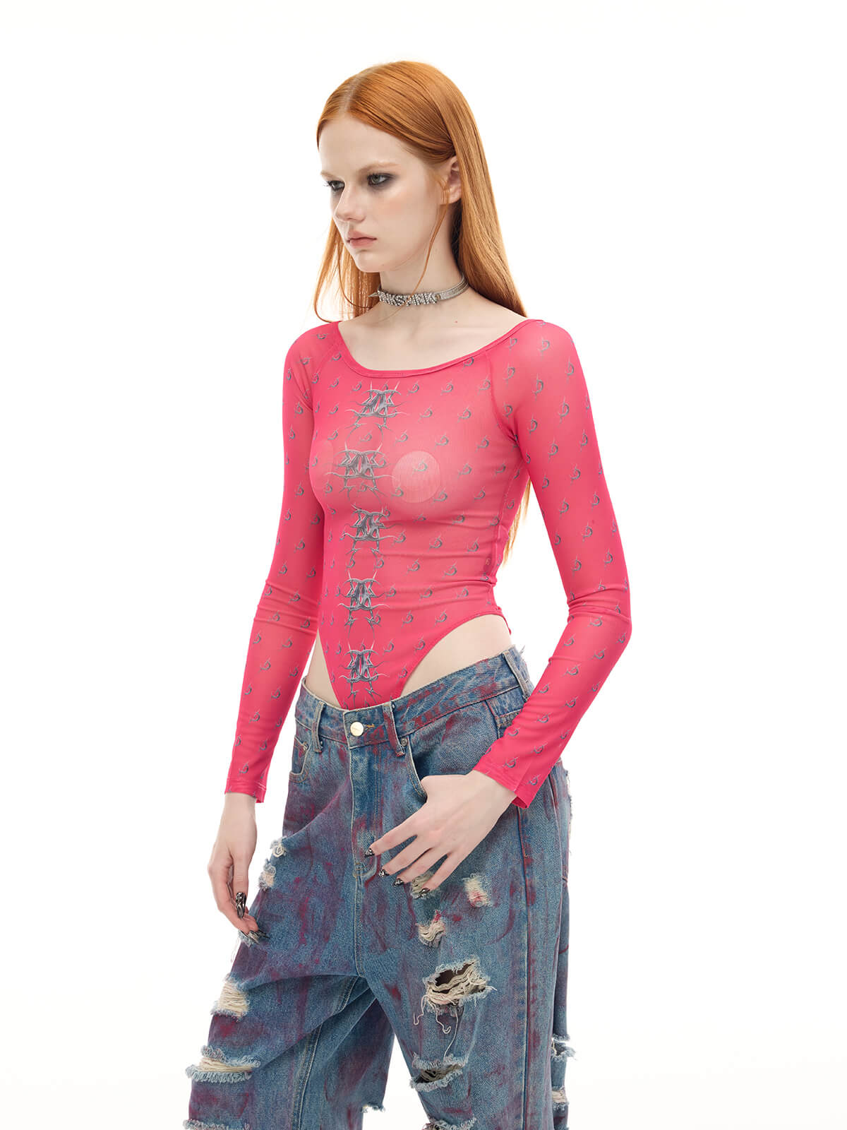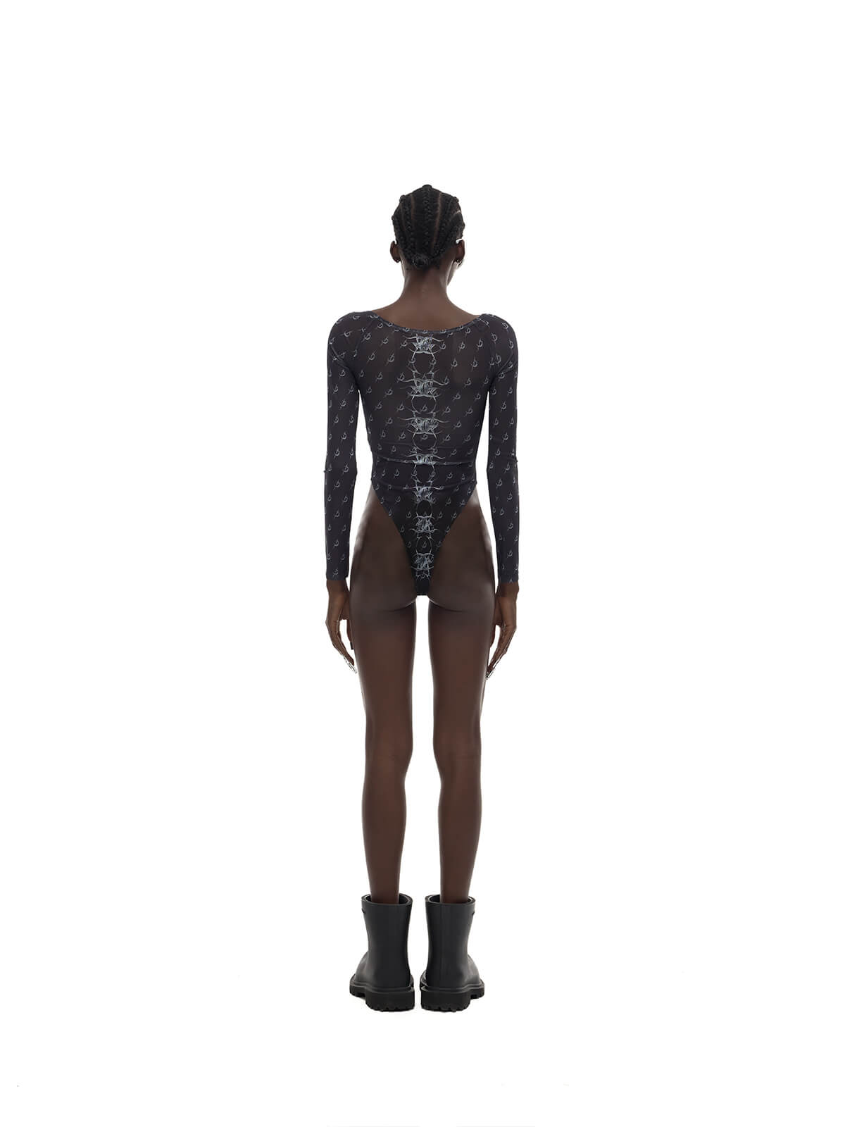 Fitted semi-sheer bodysuit with long sleeves and high waist.