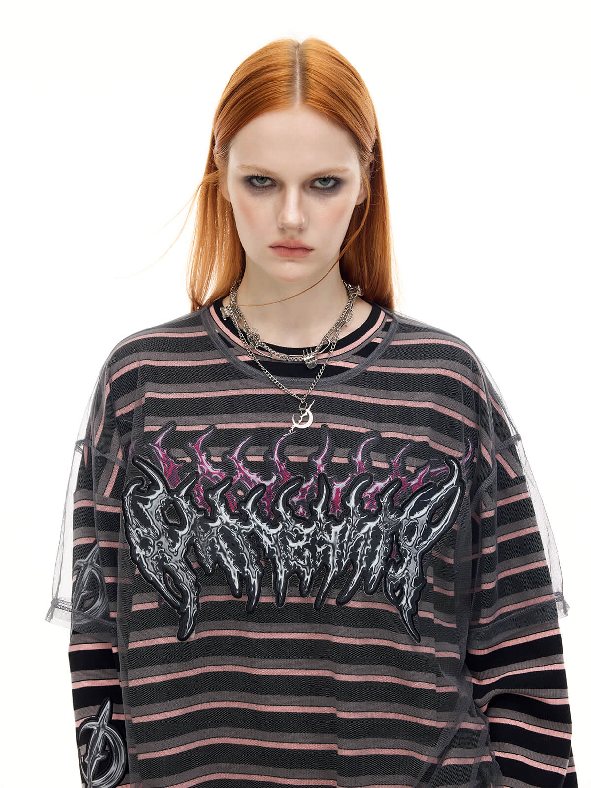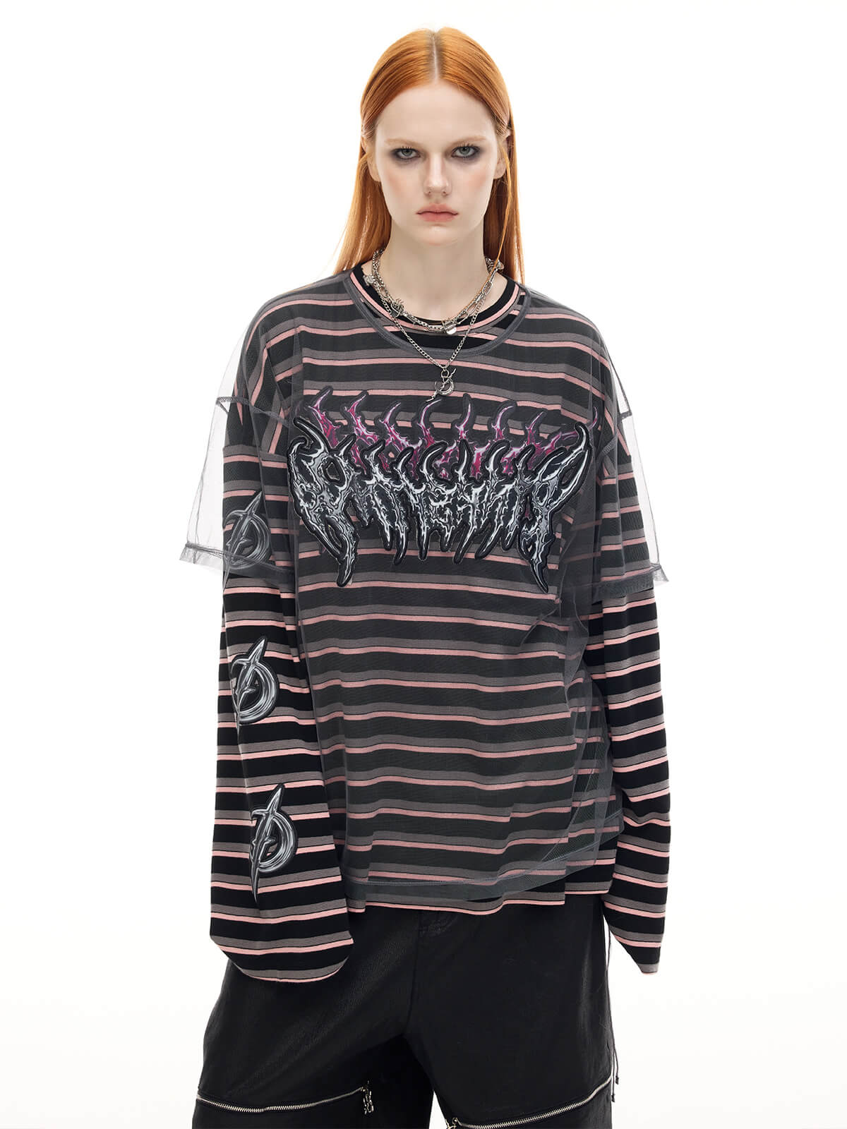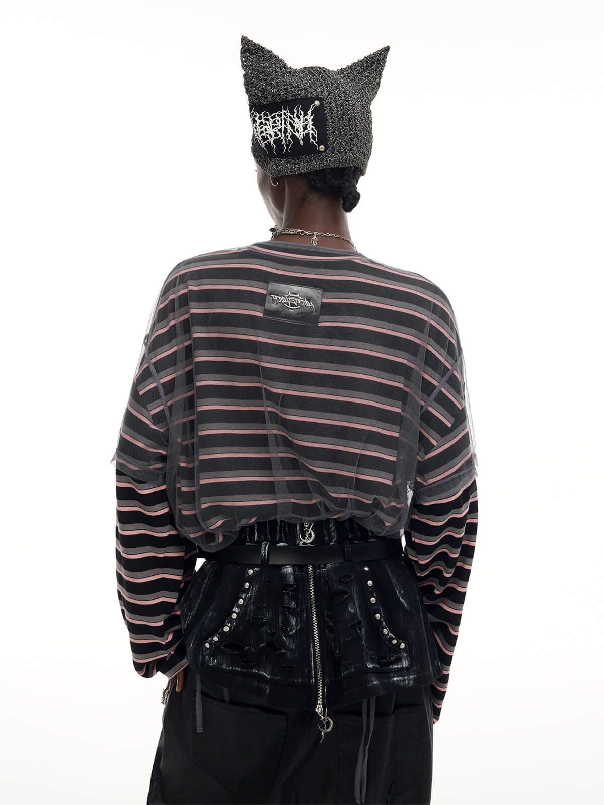 Long-sleeve striped t-shirt with detachable mesh overlay