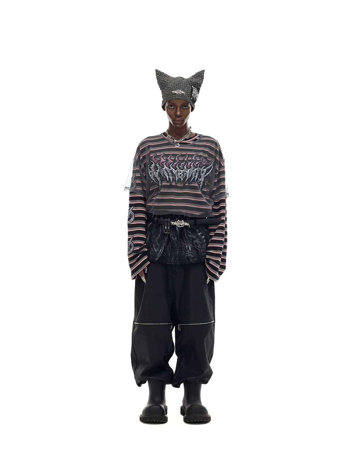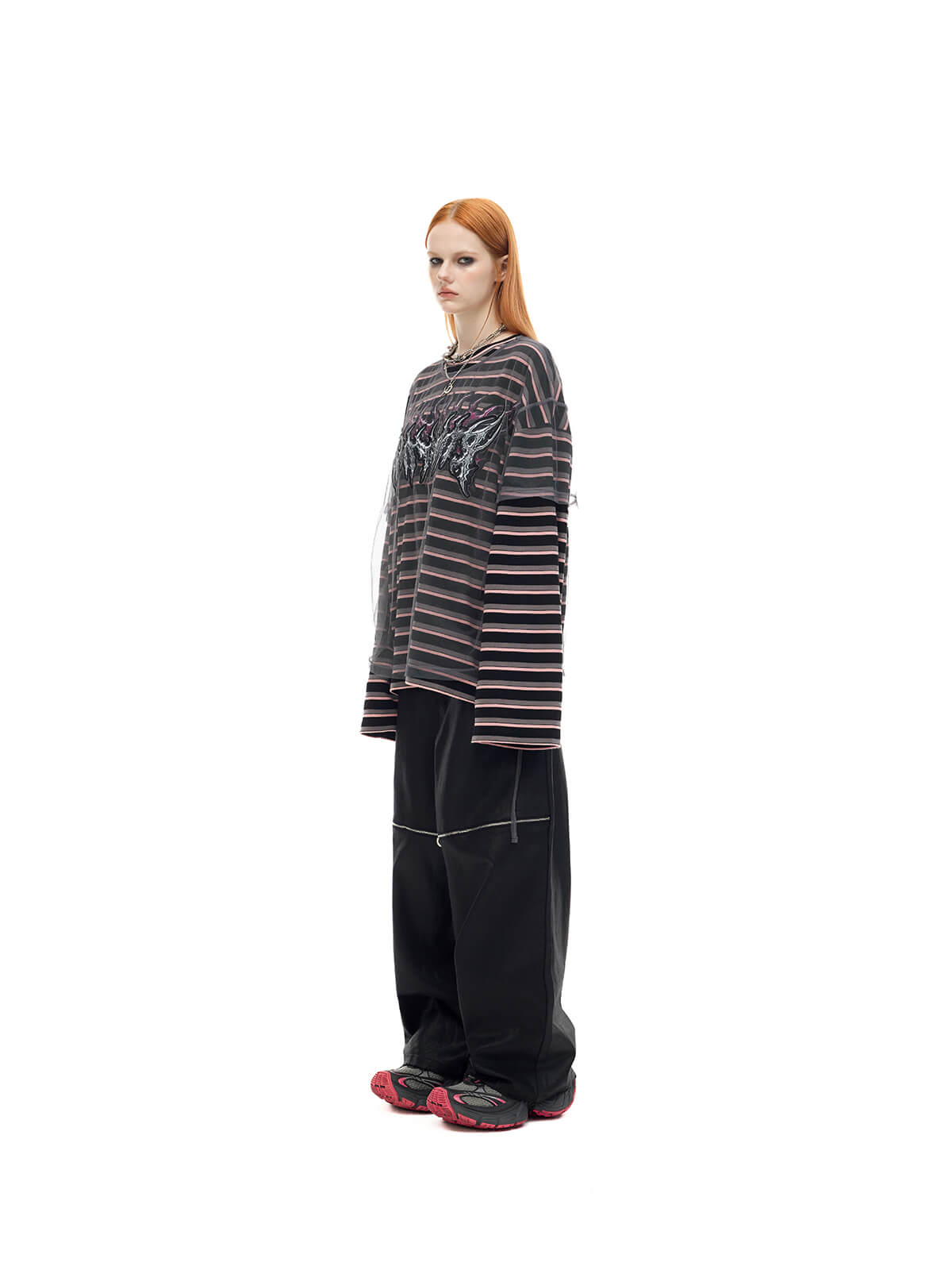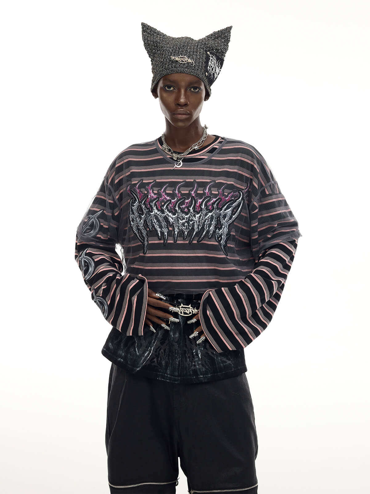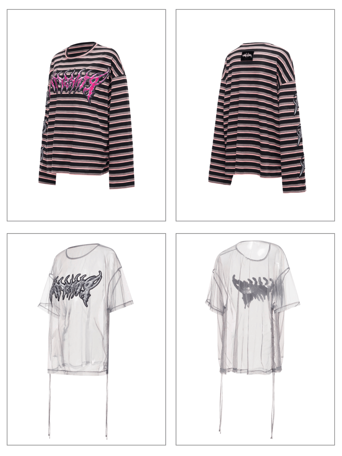 Long-sleeve striped t-shirt with detachable mesh overlay