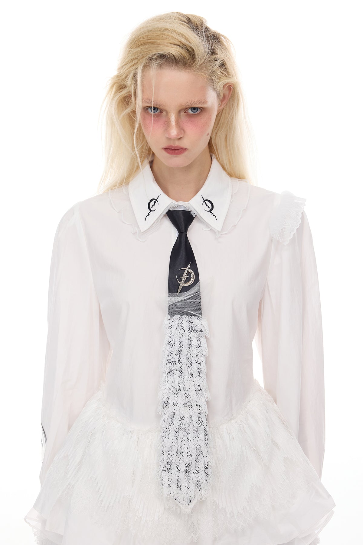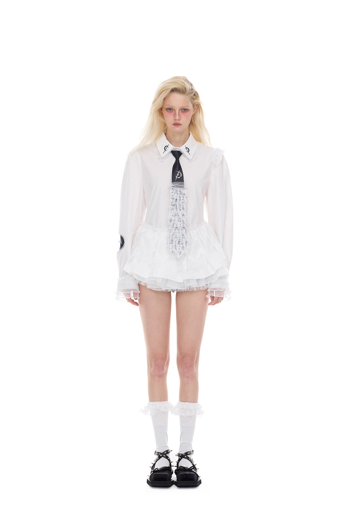 - Collar, sleeves, and hem trimmed with lace; right shoulder accented with fur.